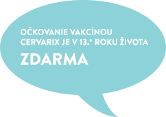 Cervarix je očkovacia látka na použitie od 9 rokov na prevenciu premalígnych anogenitálnych lézií (cervikálnych, vulválnych, vaginálnych a análnych) a karcinómov krčka maternice a anusu, ktoré príčinne súvisia s určitými onkogénnymi typmi ľudského papilomavírusu (HPV). Neočakáva sa, že prípravok Cervarix zabezpečí ochranu proti všetkým kolujúcim typom HPV. Vakcína Cervarix je viazaná na lekársky predpis. Starostlivo si prečítajte príbalovú informáciu dostupnú aj na stránkach www.sukl.sk a www.gsk-kompendium.sk. Je hradená z prostriedkov verejného zdravotného poistenia pre osoby v 13. roku života. Očkovanie vykonáva lekár injekciou do svalu. O očkovaní sa poraďte s lekárom Vášho dieťaťa. Prípadné nežiaduce účinky, prosím, nahláste aj na sk-safety@gsk.com. Reklamný materiál je určený laickej verejnosti ako súčasť očkovacej kampane schválenej MZSR číslo: 13/2019-OF